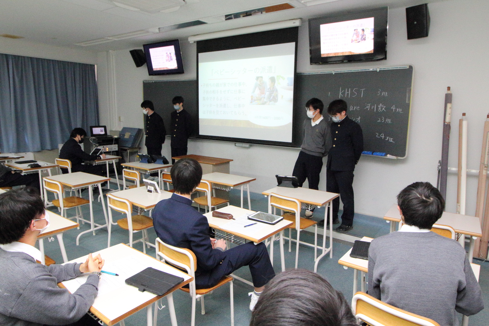生徒たちは、次のように活動をしてきました。まず、各企業の理念、商品、サ-ビスなどを学習しました。その上で、「5G」、「IoT」、「SDGs」、「with(アフタ-)コロナ」、「健康維持・増進」、「ミルクプロテイン」、「テレワ-クの普及での働き方、環境の変化」、「免疫力を高めて促進する“ビフィズス菌”の力」といった課題のキ-ワ-ドをひもときながら、課題解決に向け各グル-プで議論を深め、プレゼンテ-ションを行いました。Z世代の生徒達がこれからのVUCA時代を切り開いていく上で、大切な学習となりました。今回の発表にて、3月に行われる全国大会のエントリ-・チ-ムが決定されます。