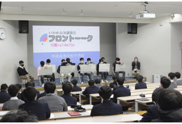 講演会では、それぞれの生徒が入試に向けての勉強法や学校での時間の使い方、工夫などの話をしてくれたり、質問に答えたりしてくれました。新年度の高1~高3までのフロントランナークラスの生徒たちは、先輩の取り組みやアドバイスを熱心に聞いていました。