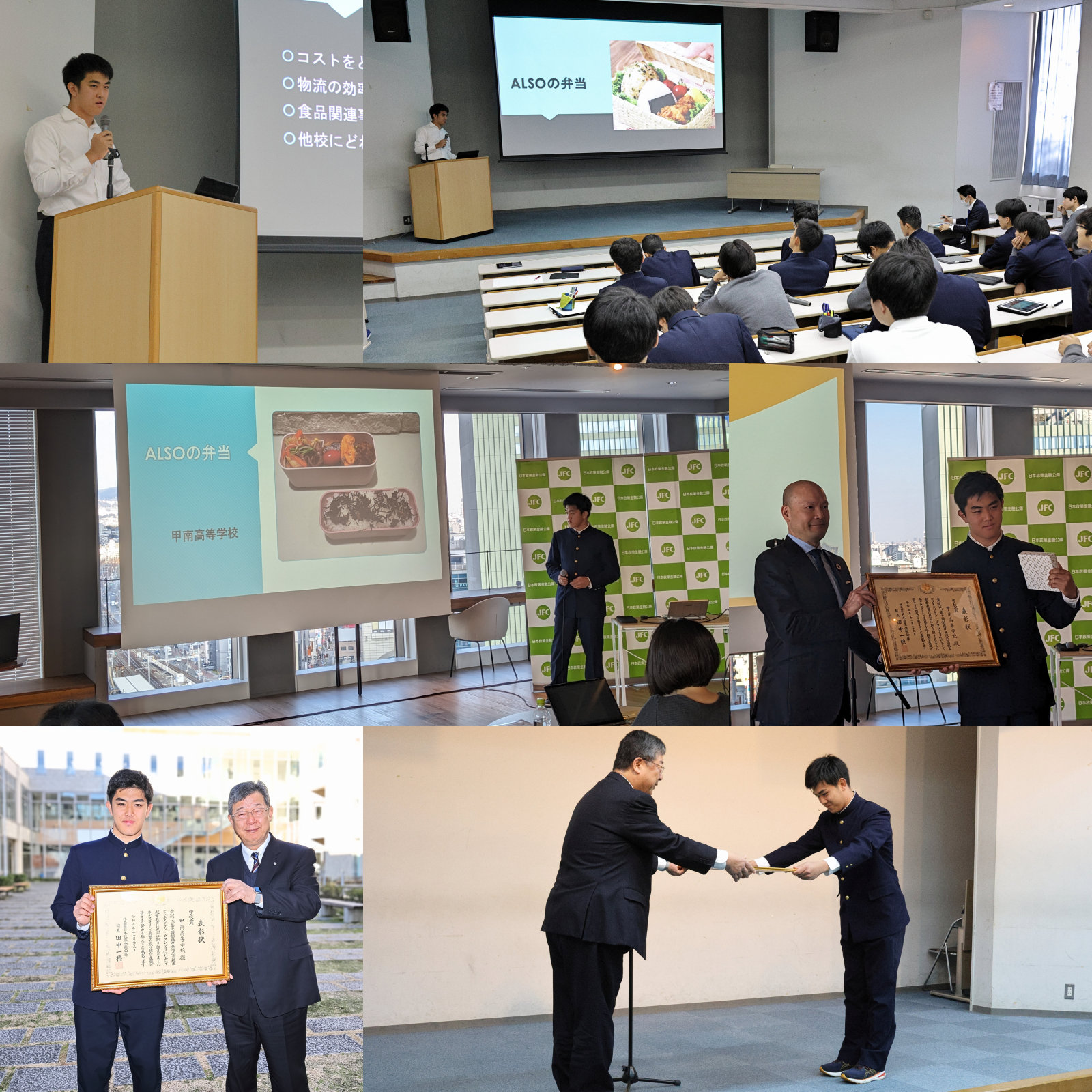 第11回高校生ビジネスプラン・グランプリ(日本政策金融公庫主催)において学校賞を受賞しました。全国505校の参加校の中から、29校が選出されました。高校アドバンストコ-ス、キャリアデザインにおける授業での取り組みです。11月には、3年生の代表10名がビジネスプランの発表を行いました。日本政策金融公庫 神戸創業支援センター 所長 関谷 善行様から講評をいただきました。12月26日には、兵庫県での表彰式が行われました。代表として、3年生の阿部英彦さんが参加し、受賞およびプレゼンで-ション(「ALSO」、朝食を抜き取りがちな学生が十分に食事をとれるように、前日にECサイトで注文を受けて、学校に朝食弁当を届けるプラン)を行いました。この取り組みは2014年度より行っています。2015年度には高校生ビジネスプラン・ベスト100に選ばれました。