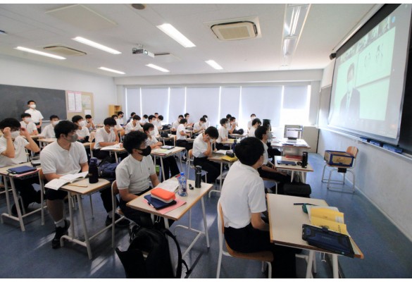 山内学校長からは、新型コロナウイルスの感染状況などについて細かなデータで説明が行われました。また、TBSのドラマ「半沢直樹」に出演する香川照之さんの経歴や芸能活動について紹介され、子供の頃から昆虫に関心を持ち、現在NHK・Eテレ番組「香川照之の昆虫すごいぜ!」に出演されている話をされました。生徒たちに学校での学びを大切にし、自分の得意分野を持ち、伸ばしていくようにと伝えられました。