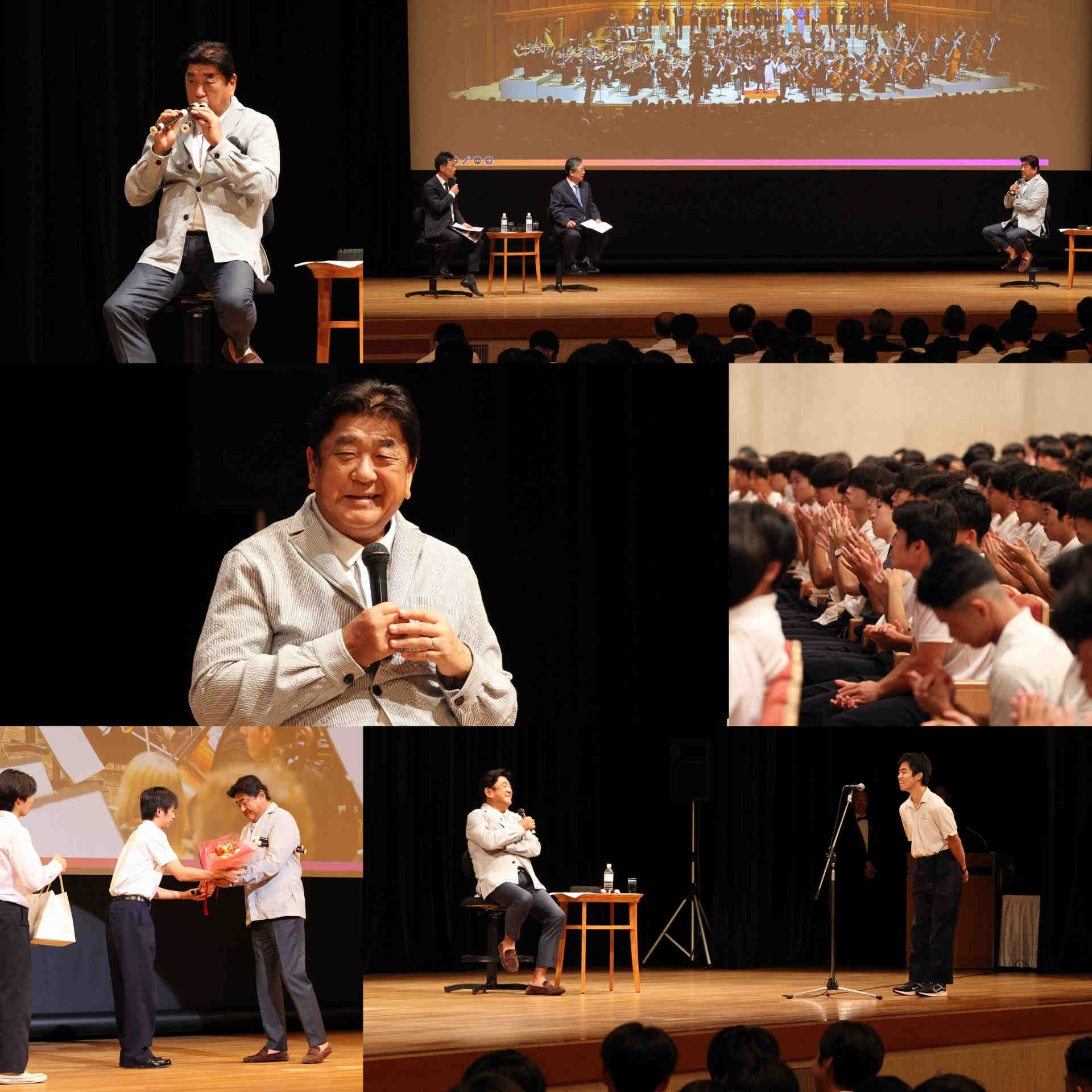 文化祭週間初日の9月25日(木)10時30分より、ポートピアホテル国際会議場において「ソフィア講演会・育友会文化講演会」を開催しました。今回は、日本を代表する世界的指揮者・佐渡裕氏をお迎えし、「ティーンエイジャーが奇跡を起こす」と題してご講演いただきました。壇上では、山内校長と音楽科の今田教諭が聞き手を務め、和やかな雰囲気の中で進められました。