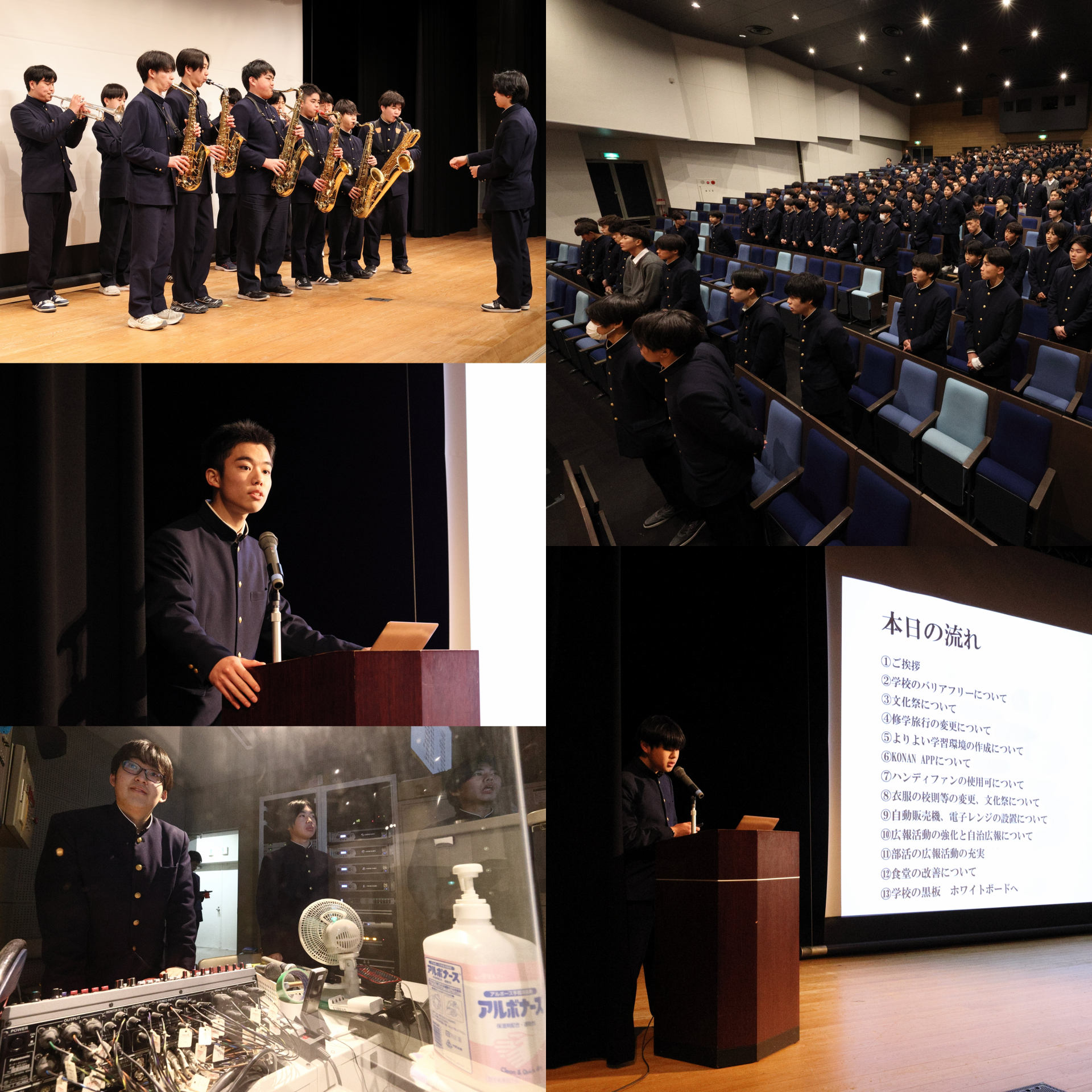 抱負や取り組みでは、学校のバリアフリー化(建物面・心理面・情報面)、文化祭における有志出店の拡大、修学旅行の行き先決定への生徒意見の反映、学習環境(空調)の改善、甲南アプリの開発や学校ウェブサイトの改善、チャットによる意見箱の企画、ハンディファンの使用提案、服装規定の見直し、自動販売機の変更や電子レンジの設置、自治会広報の強化、食堂の混雑緩和、黒板のホワイトボード化など、多岐にわたる活動内容が紹介されました。生徒たちは、熱意のこもったプレゼンテーションに耳を傾け、今後の自治会活動への理解を深めていました。