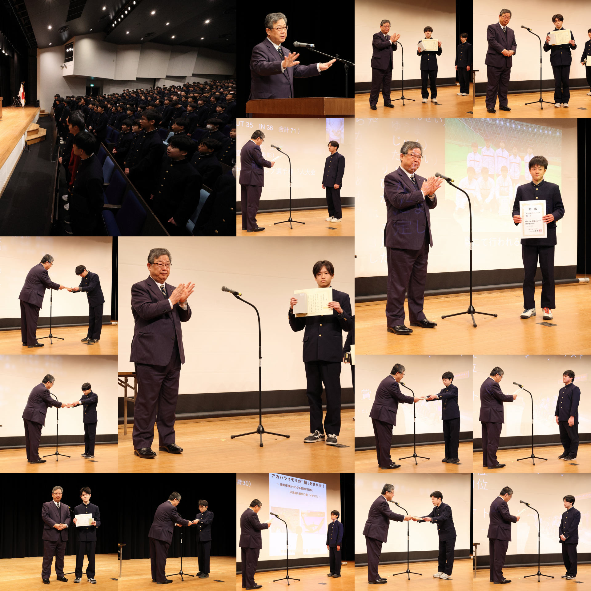 続いて、今年度の学業成績優秀者表彰が行われました。各学年・各コースの成績優秀者が呼名され、高校2年生の優秀者が代表として壇上に上がり、表彰状を受け取りました。また、3学期の部活動表彰では、中学テニス部、高校アーチェリー部、高校ゴルフ部、高校バレーボール部、中学ブラスアンサンブル部の団体・個人、ならびに、生け花やサイエンスコンクールなどで実績を上げた生徒に、表彰状が贈られました。このほか、高校1年生「エッセイコンテスト」、中学1年生「平生先生のことば作文コンクール」、中学「自学自修」、中学1年生「自由研究」、中学「計算テスト」の優秀者、ならびに学外の「おかしのちから作文コンテスト」における学校賞の表彰が行われました。
