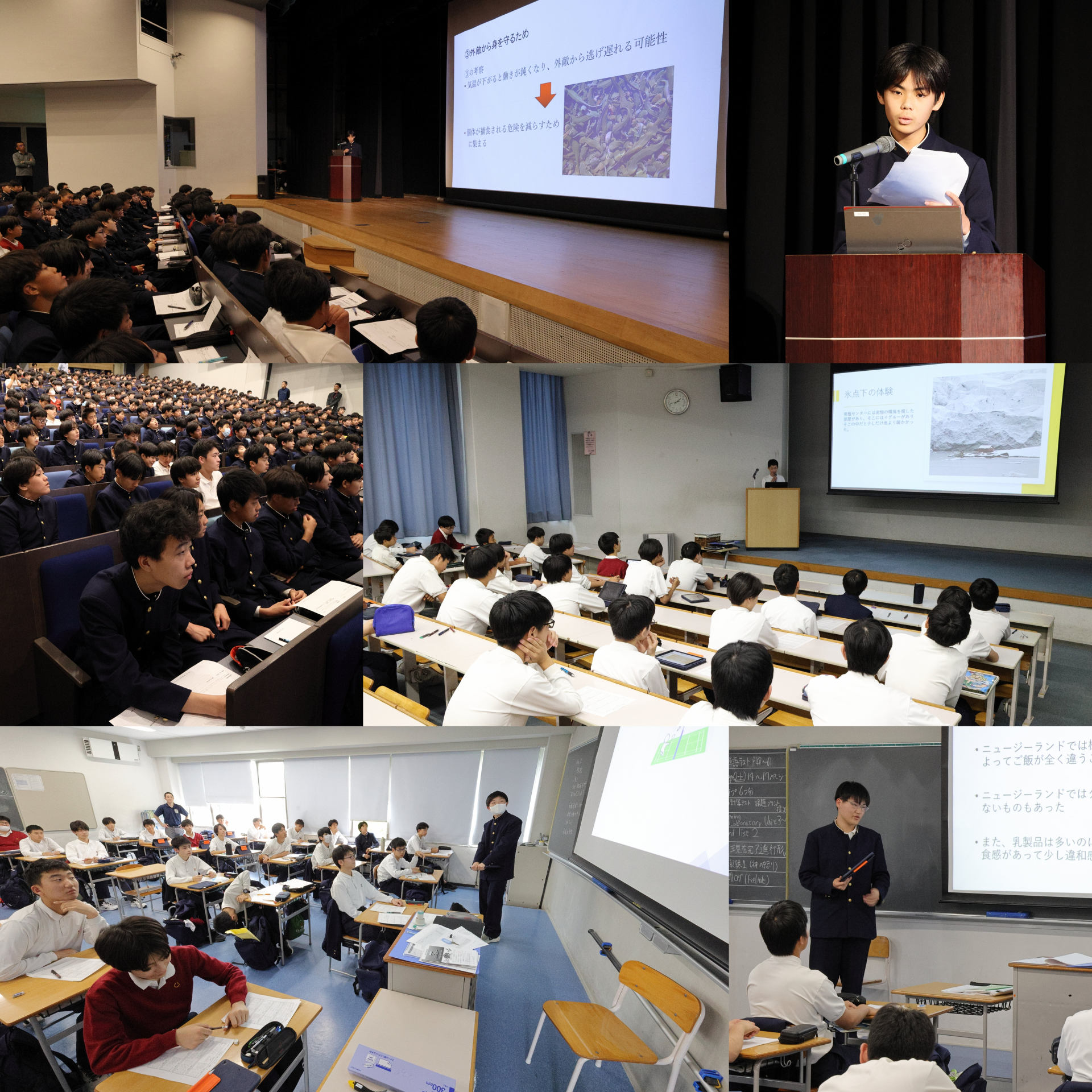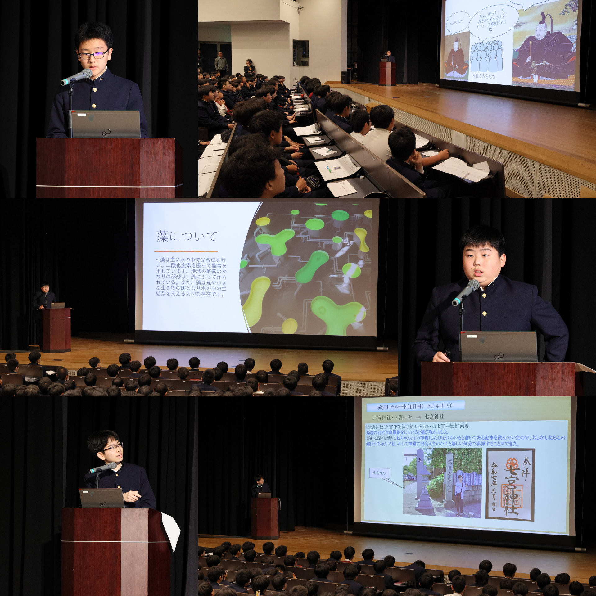 4月15日(水)、中学生の自学自修発表会を行いました。このプログラムでは、生徒一人ひとりが自らの興味関心に基づき、主体的に学びのテーマを設定し、探究活動を行います。今回の「自学自修発表会」では、前年度の優秀者4名が、講堂にて全中学年の前で発表を行いました。発表を通して生徒同士が多くの学びを共有し、知識を高めあうことができました。