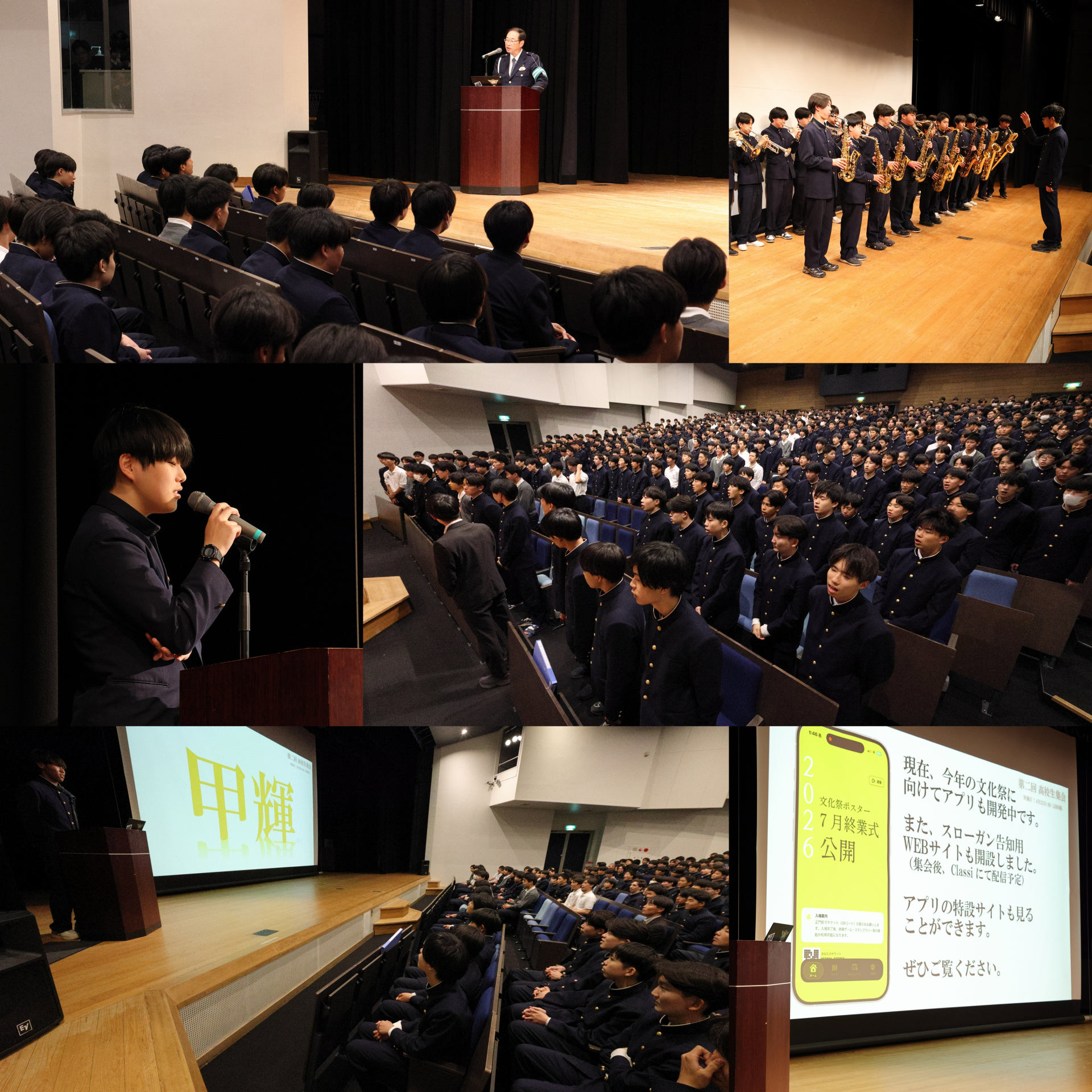 4月22日(水)、講堂で高校生集会を実施しました。自治会総務(生徒会)からは、文化祭や体育祭、美化風紀、校則の見直しなどに関する告知および報告がありました。文化祭については、今年のスローガン「甲輝」が発表され、展示や発表を見学するだけでなく、有志企画などを通して生徒一人ひとりが参加する文化祭を目指していこうと呼びかけがありました。