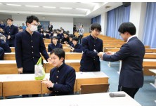 1月16日(木)午後、センター試験を受験する高校3年生を激励する「センター試験壮行会」が行われました。最初に、吉田教頭・進路指導部長から受験に関する心構えが話されました。次に、西田学年主任から「新コースの一期生として努力してきた君たちは満点だ。自信を持って受験するように。」と励ましの言葉が贈られました。続いて、一人一人に合格祈願の記念品が渡され、また、昨年末から続いた「センター・マラソン」の皆勤者・精勤者には試験で役立つ鉛筆が手渡されました。最後に、学年団の先生方が壇上にそろい、応援のエールを贈りました。受験生の皆さん、ベストを尽くされることを祈念します。