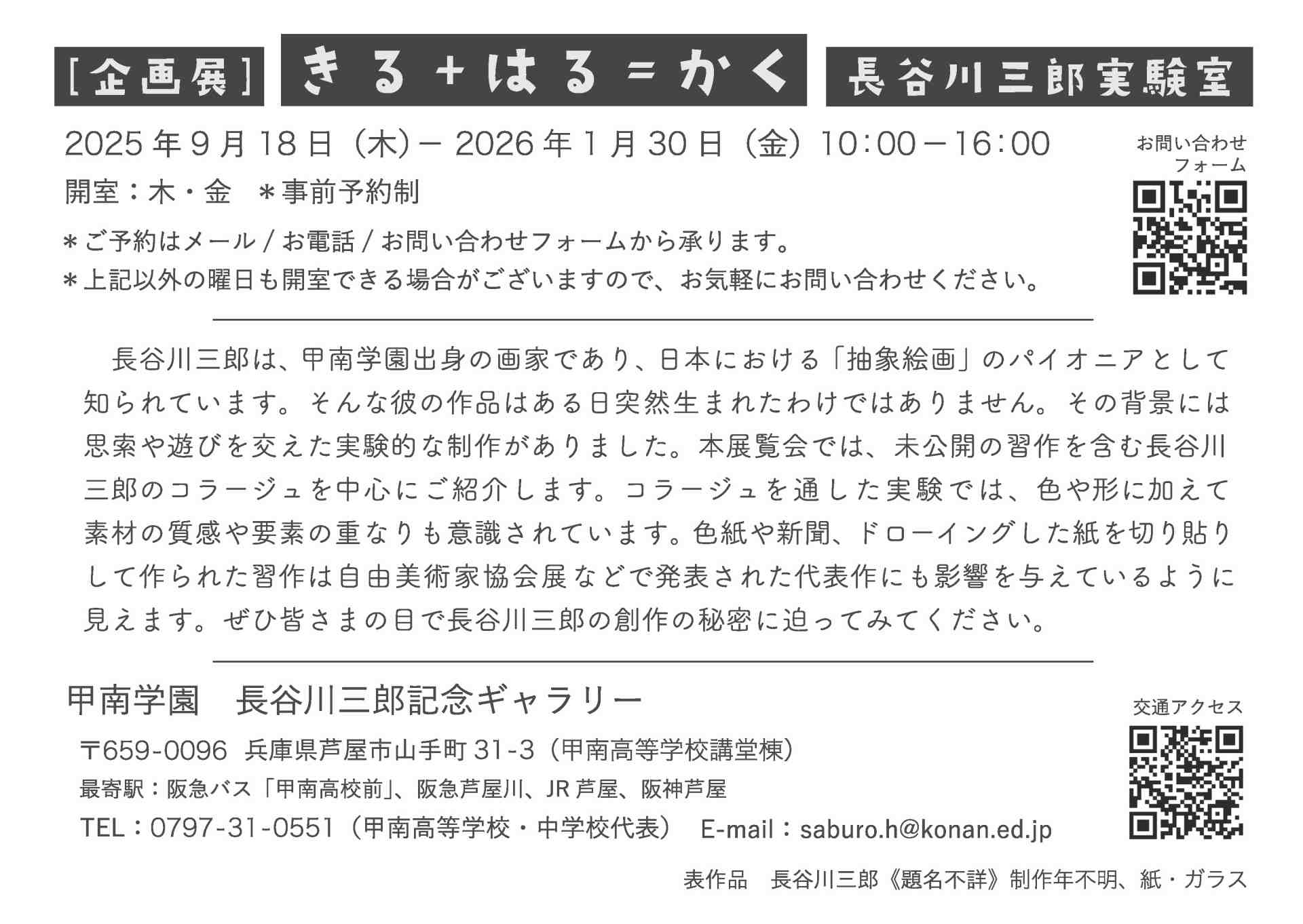 長谷川三郎記念ギャラリーにて、企画展「きる+はる=かく 長谷川三郎実験室」を開催いたします。長谷川三郎(1906−1957)は、甲南学園出身の画家であり、日本における抽象絵画のパイオニアとして知られています。そんな彼の作品はある日突然生まれたわけではありません。その背景には思索や遊びを交えた実験的な制作がありました。